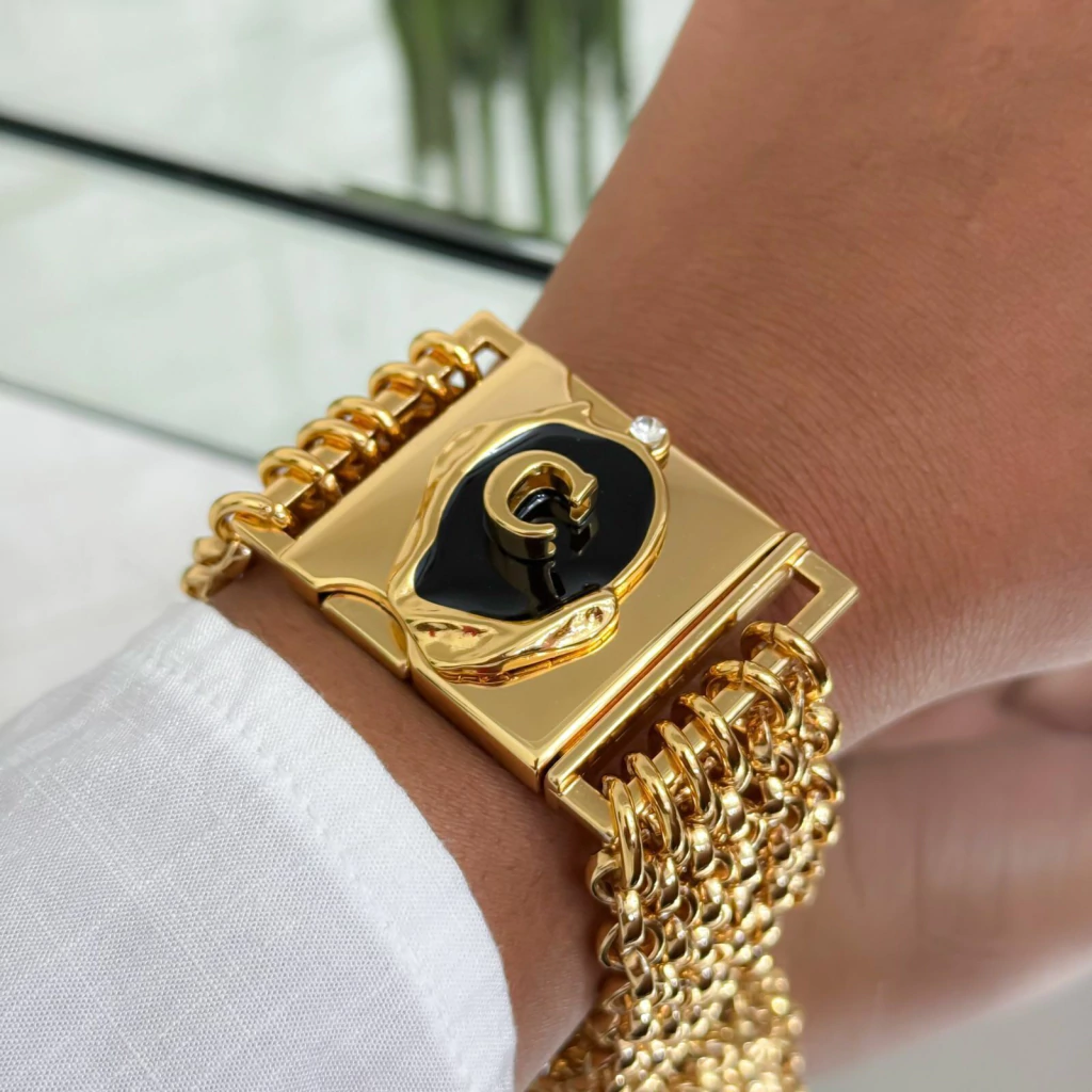 Esta pulseira de várias voltas em corrente de elo português é uma peça elegante e versátil, destacando-se pela placa que apresenta uma medalha preta com detalhes dourados. A medalha pode ser personalizada com a sua inicial, adicionando um toque único e pessoal ao acessório.