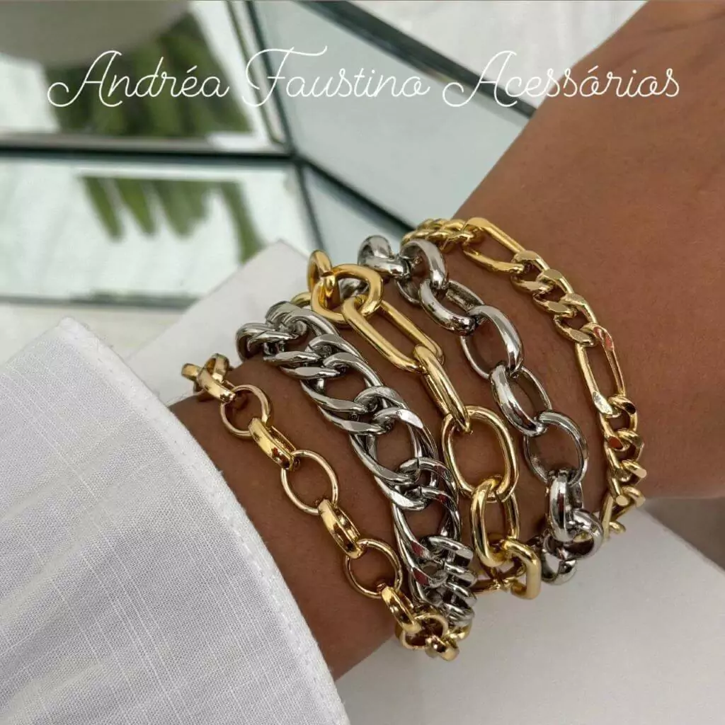 Esta pulseira contemporânea e estilosa é composta por várias voltas de correntaria bicolor, combinando metais em tons distintos para um efeito visual dinâmico e moderno. A mistura de diferentes estilos de corrente traz textura e profundidade à peça, tornando-a uma escolha perfeita para quem busca um acessório único e marcante.