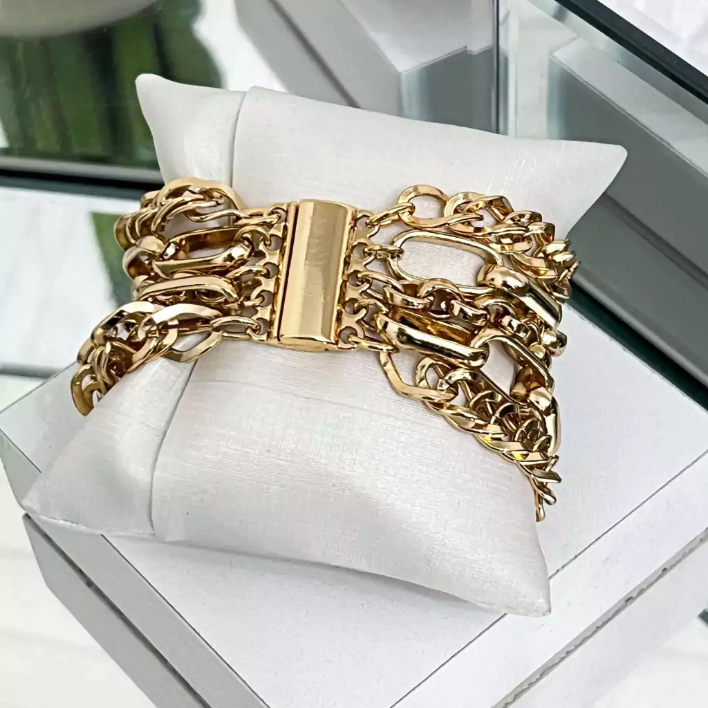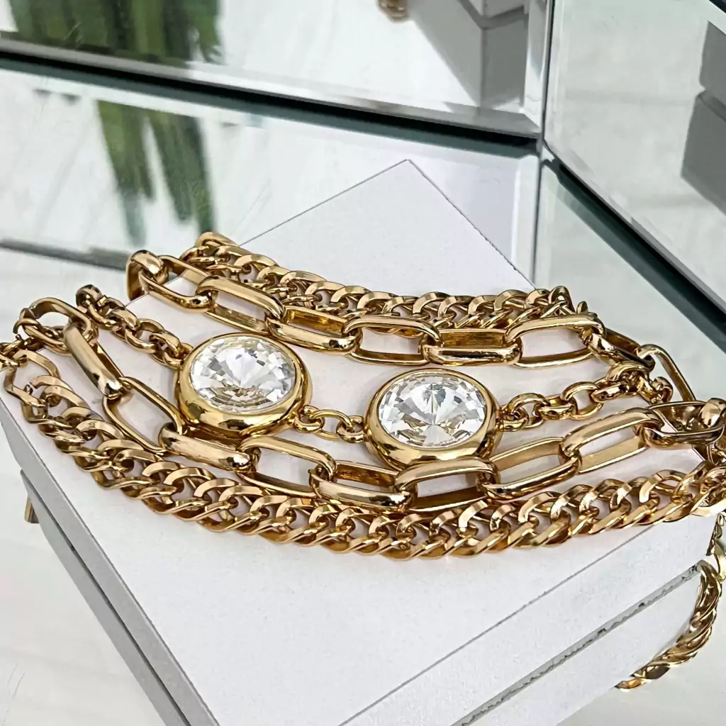 Uma pulseira dourada de várias voltas que combina o estilo clássico da corrente grumet com a modernidade de uma corrente retangular grossa. O design é enriquecido por pingentes de pedra de strass, que adicionam um brilho sofisticado e tornam a peça elegante e impactante.