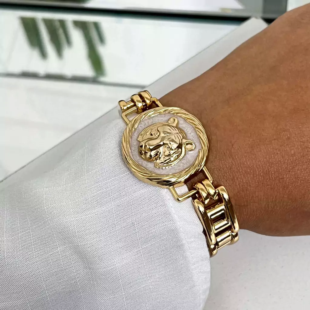 Uma pulseira dourada em corrente trabalhada grossa, com um design robusto e sofisticado. O acabamento é feito com fecho ímã, garantindo praticidade e segurança. A peça é adornada com passa-tiras de animal print resinado em madrepérola, que trazem um toque de modernidade e elegância, unindo o clássico e o contemporâneo de forma única.