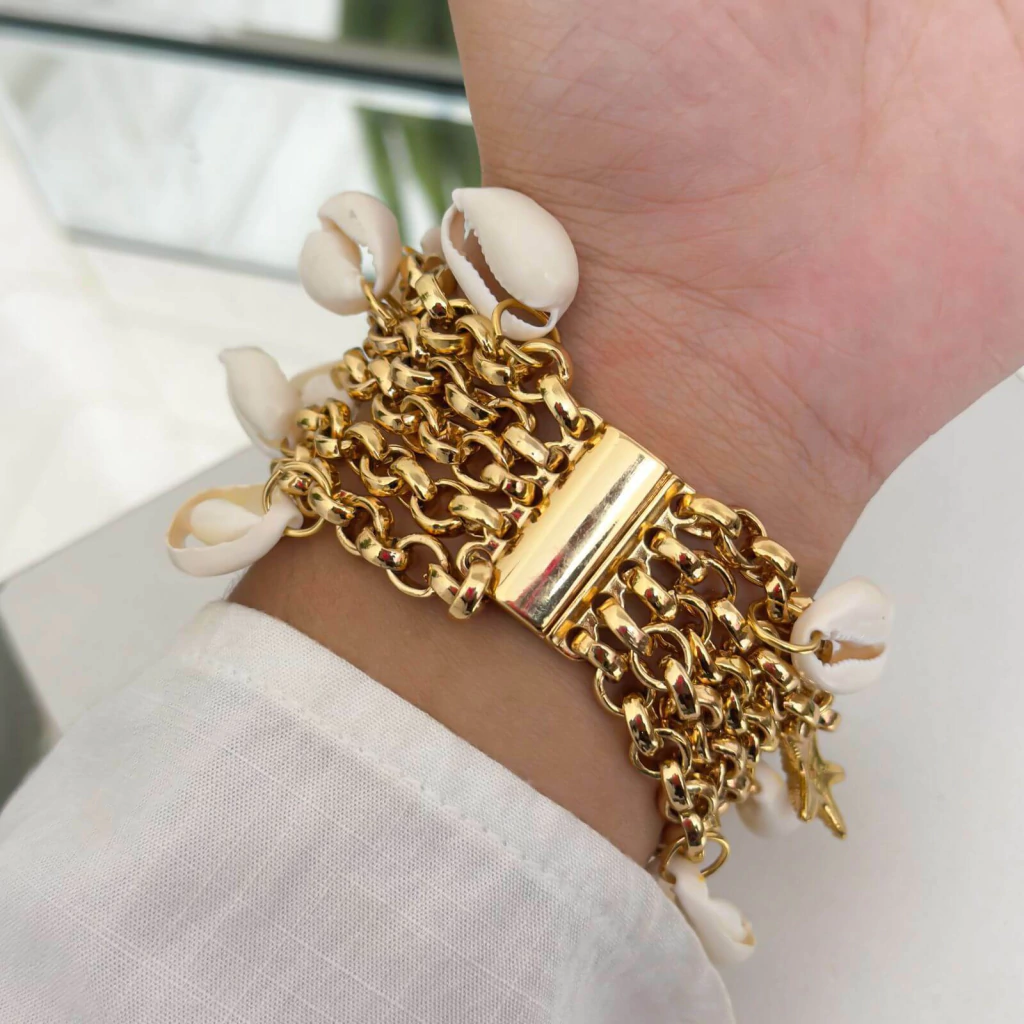 Pulseira dourada em corrente elo português grossa, com acabamento em fecho ímã, garantindo praticidade e segurança. Medindo 20cm, mas podendo ser personalizada no tamanho que você desejar (basta nos enviar pelo WhatsApp: 21 976081720). A pulseira é adornada com um pingente delicado de Búzios Naturais, Concha, Peixe, Estrela do Mar ou Golfinho, trazendo um toque de natureza e estilo para o seu visual.