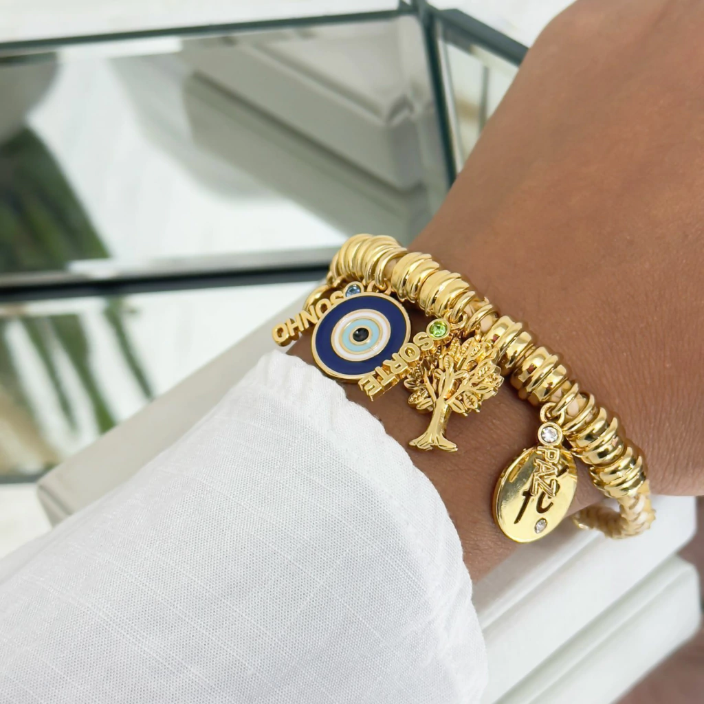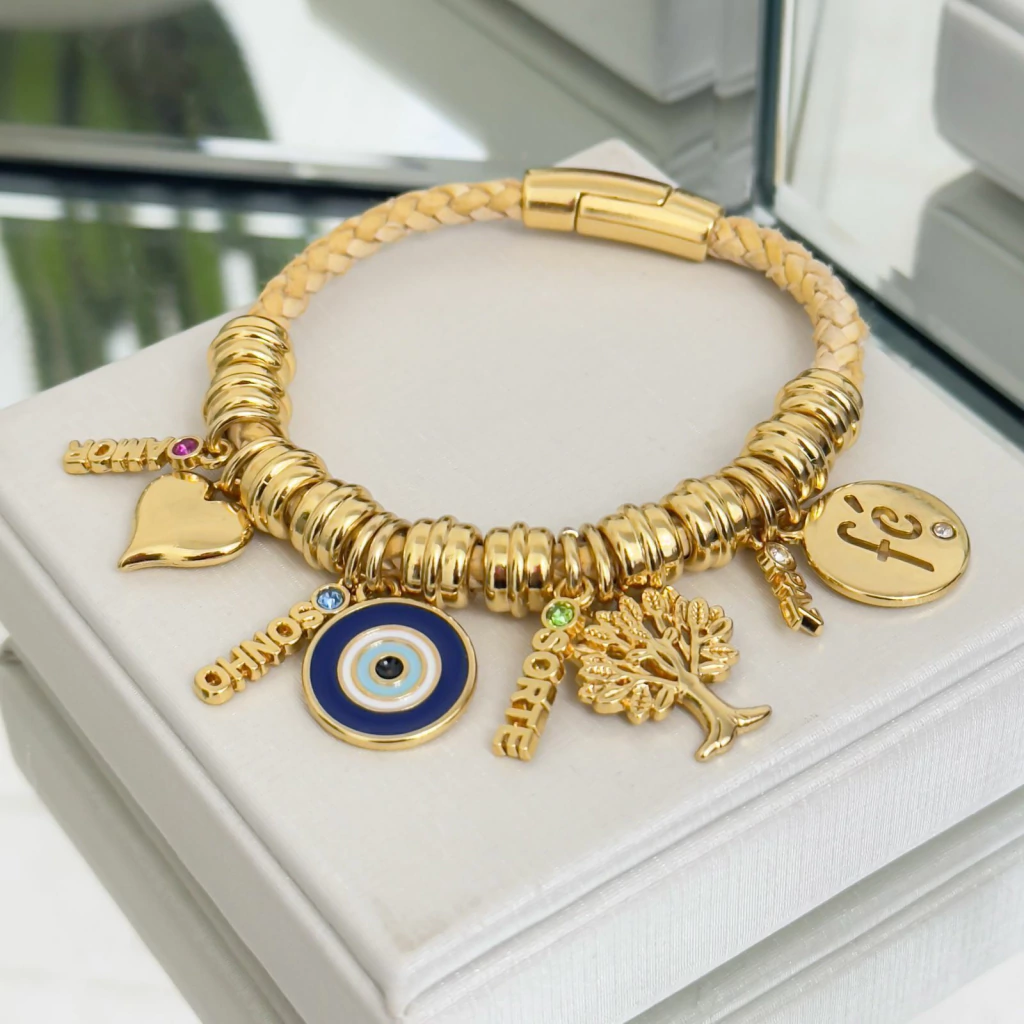 Pulseira com pingentes medindo: Olho Grego 20MM / Árvore 22MM / Fé 20MM / Coração 17MM