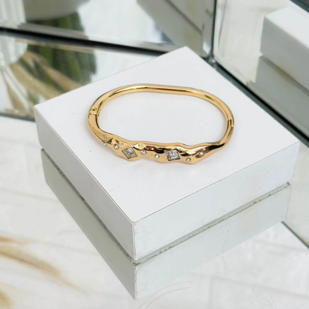 Bracelete dourado igualmente adornado com strass, e um anel dourado regulável, todos com acabamento em fecho encaixe. Um bracelete perfeito para quem busca elegância e brilho em cada detalhe!