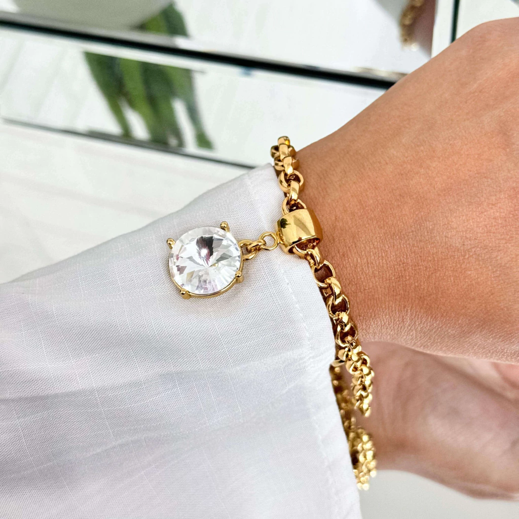 Nossa pulseira dourada com strass é perfeita para quem ama um toque de glamour sem perder a delicadeza. Com brilho sutil e acabamento refinado, ela eleva qualquer look — do casual ao mais sofisticado.