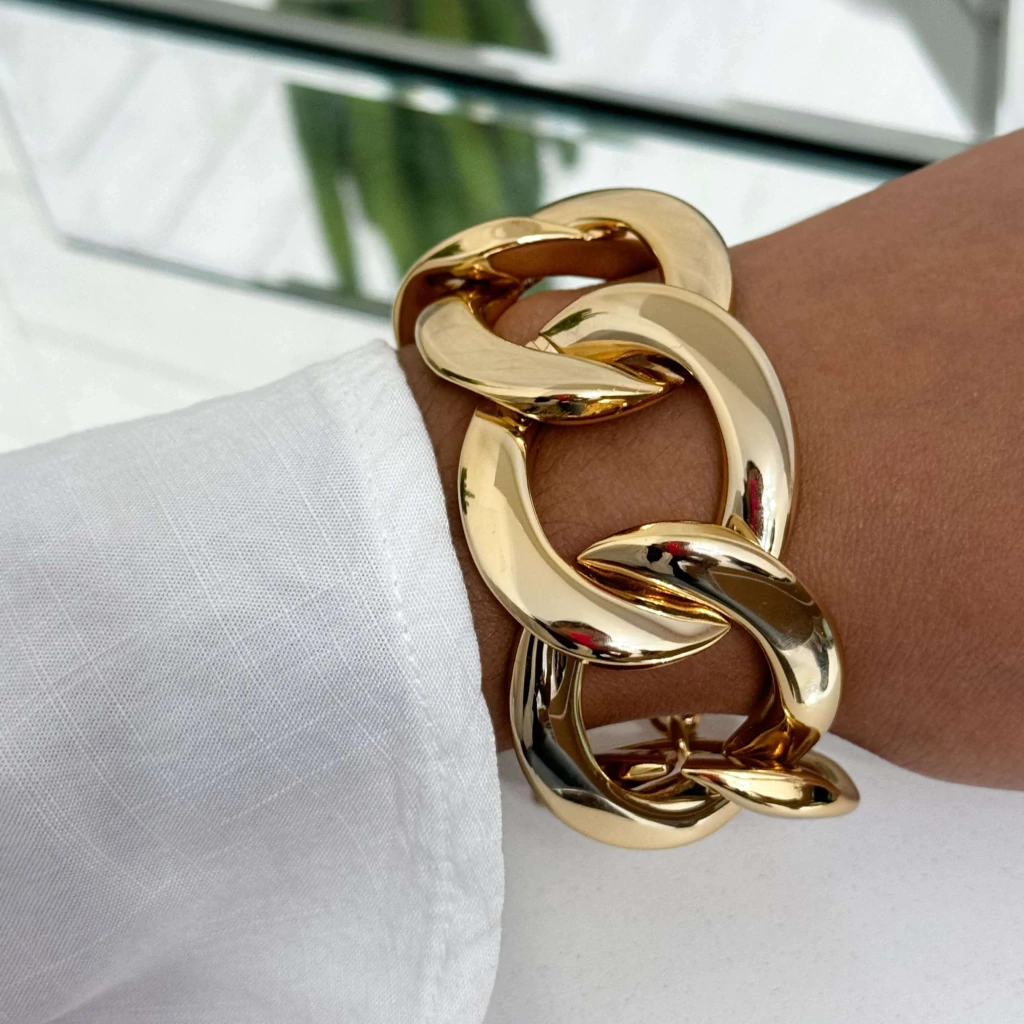 Com formato redondo e acabamento dourado, esse bracelete é ideal para dar um toque de charme e elegância ao visual de forma prática e leve.