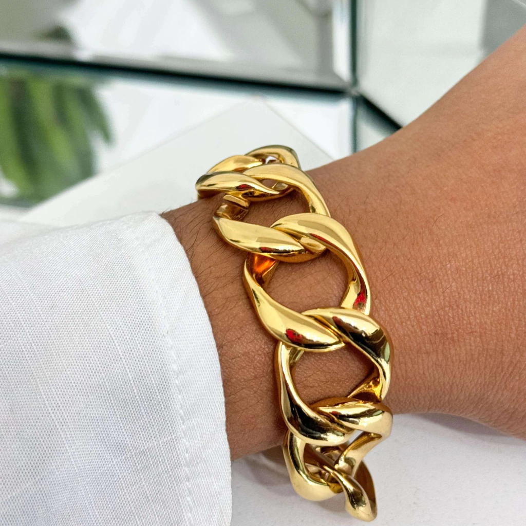 Os elos redondos dão movimento e brilho ao pulso de forma discreta, mas cheia de presença.