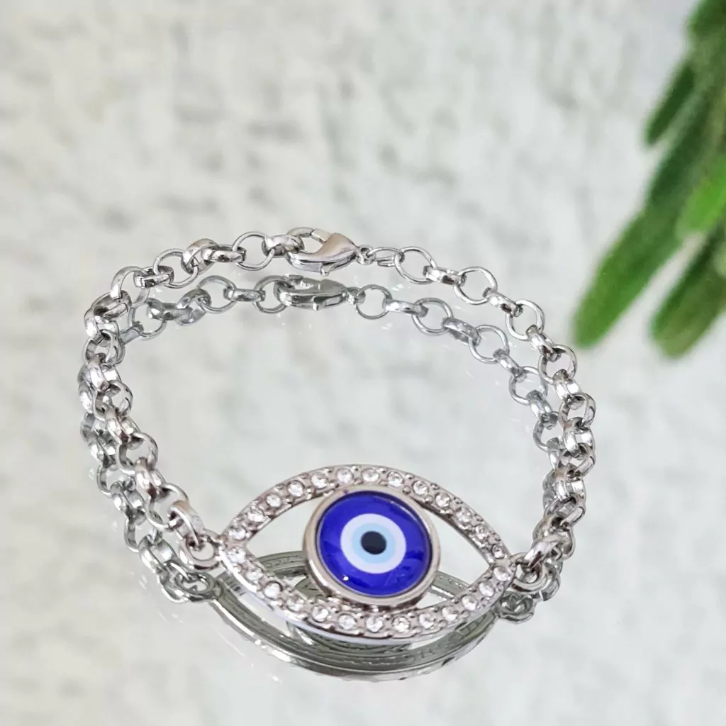 Esta pulseira delicada é confeccionada em corrente elo português fina, oferecendo um visual elegante e sutil. Com acabamento em fecho lagosta, proporciona segurança e conforto ao usar. O pingente de olho grego vazado, adornado com strass, adiciona um toque de brilho e simbolismo, trazendo proteção e charme à peça.