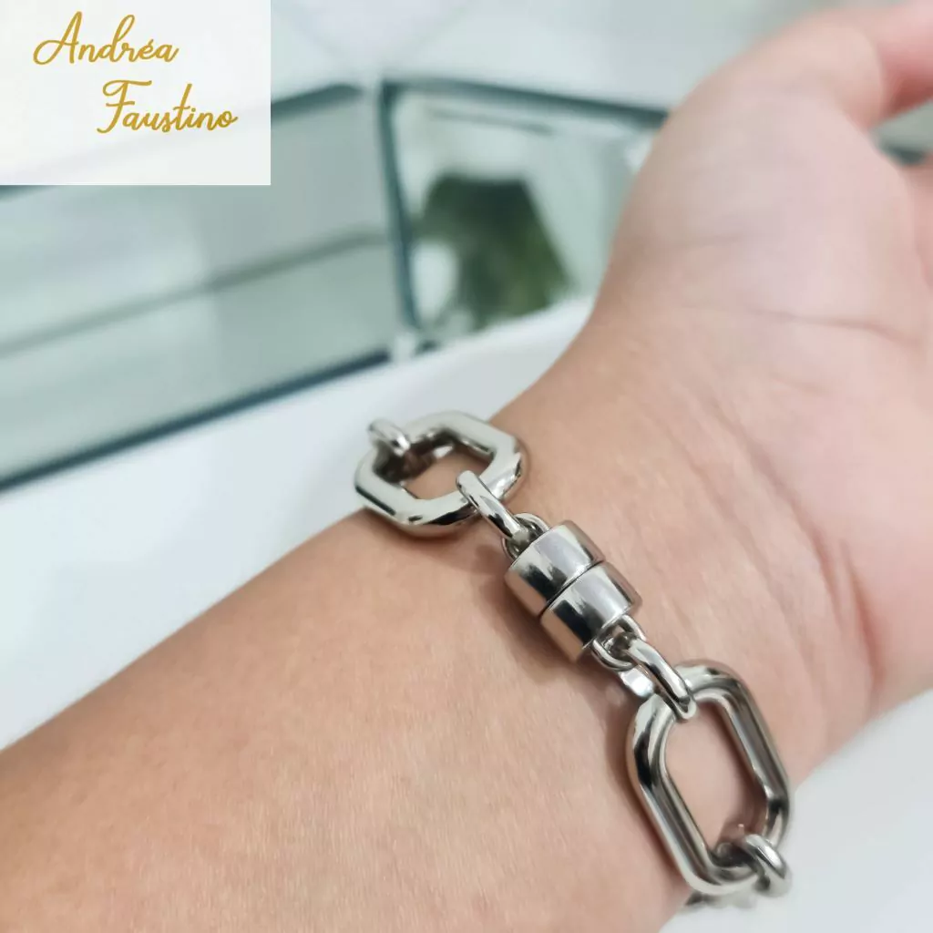 Pulseira prateada na corrente 3x1 e acabamento em fecho ímã!