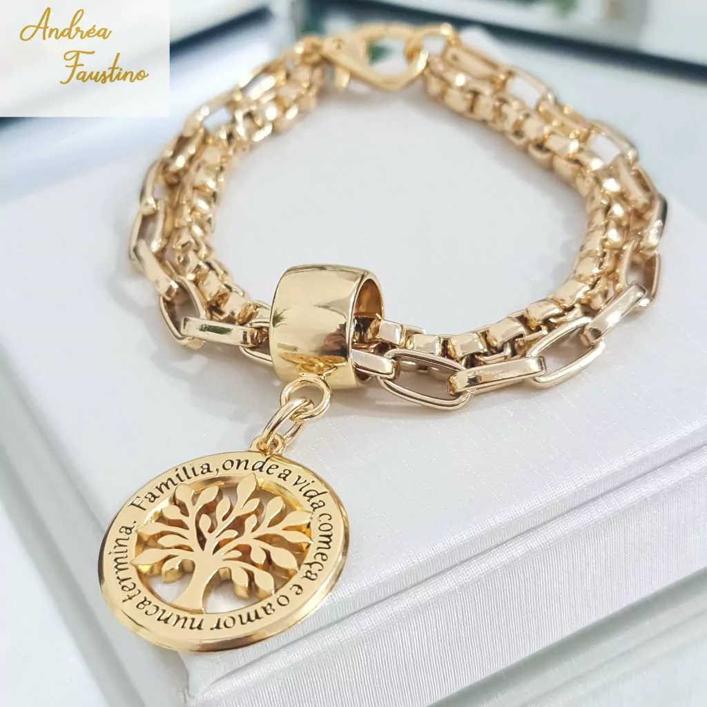 Apresentamos uma pulseira elegante dourada de duas voltas, que combina corrente veneziana e corrente de elos, criando um visual sofisticado e moderno. O destaque da peça é o pingente em forma de medalha da árvore da vida, simbolizando crescimento, força e conexão.